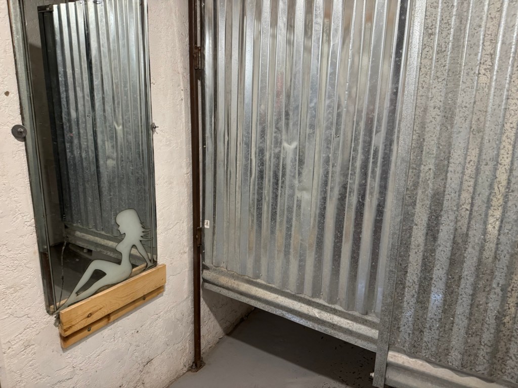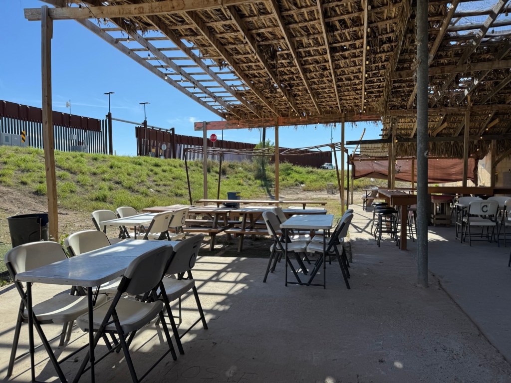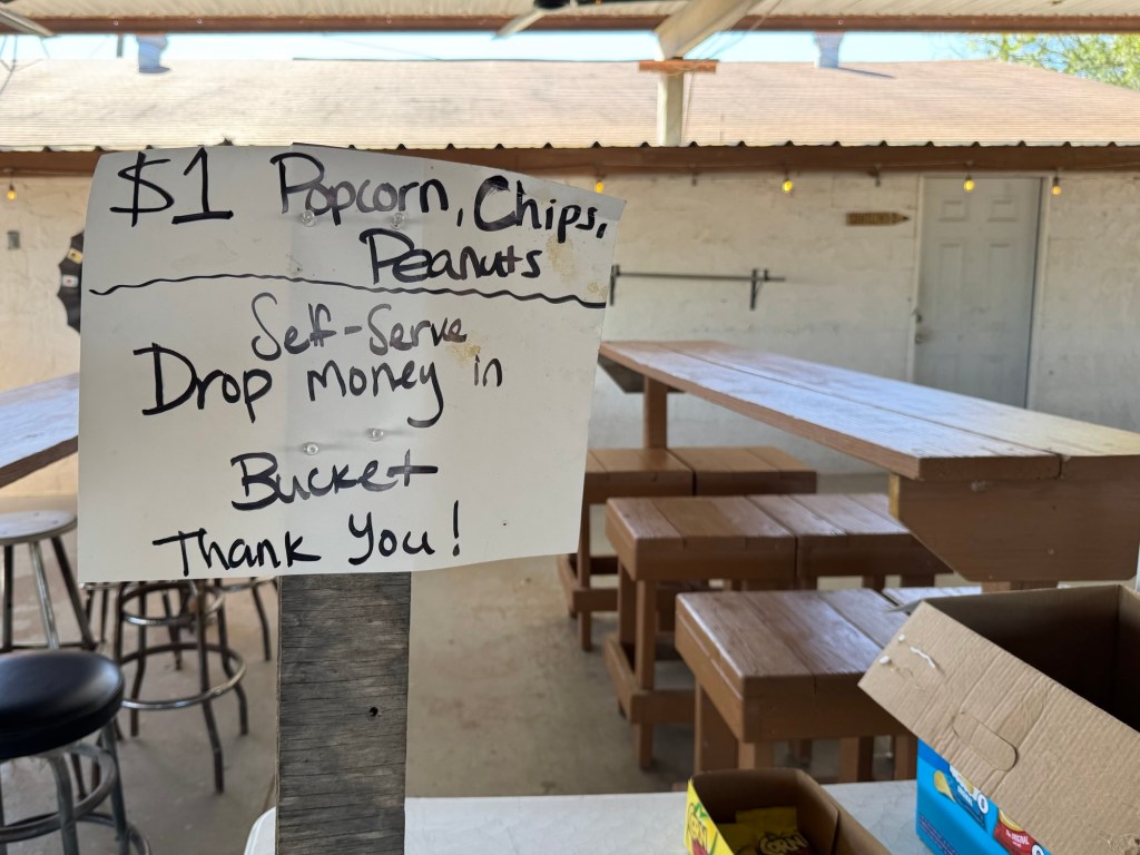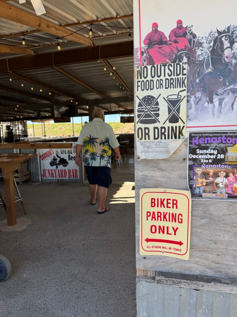I laughed at “No outside food or drink or drink”Stage is reminiscent of the old westI wonder how many actually payA tribute to a football teamThe BarThe tables have seen better daysIt makes one wonder Would hesitate to visit if it was rainingTiniest sink I’ve ever seenCorrugated metal stalls in the ladies bathroom Budweiser is famous for their adsThe fence on the hill behind hubs is a part of the border wallThe top of the original bar sign says EST 1957