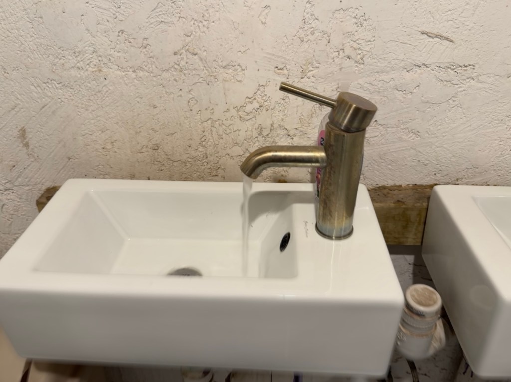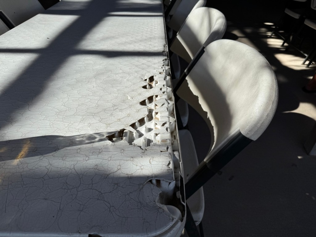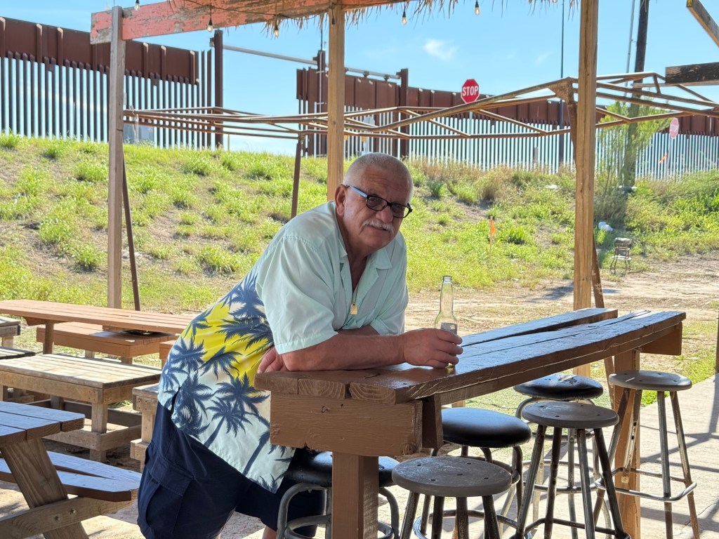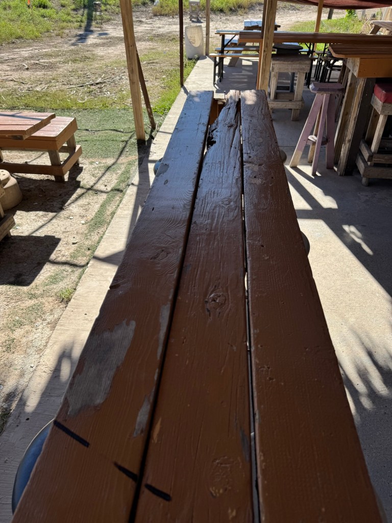 I laughed at “No outside food or drink or drink”Stage is reminiscent of the old westI wonder how many actually payA tribute to a football teamThe BarThe tables have seen better daysIt makes one wonder Would hesitate to visit if it was rainingTiniest sink I’ve ever seenCorrugated metal stalls in the ladies bathroom Budweiser is famous for their adsThe fence on the hill behind hubs is a part of the border wallThe top of the original bar sign says EST 1957